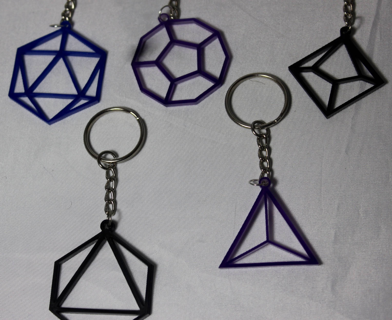 A mixed variety of dice based keychains including D20, D12, D10, D8, and D4.